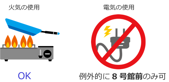 室外企画では、火を使うことができる反面、電気はほとんど使用することができません。白門祭期間中、火を使って調理ができるのは室外のみとなっていますので、火を使った調理が必要な飲食物を提供する場合、室外で企画を行っていただくことになります。また、電気機器を使うためのコンセントは8号館前にしか設置されていません。