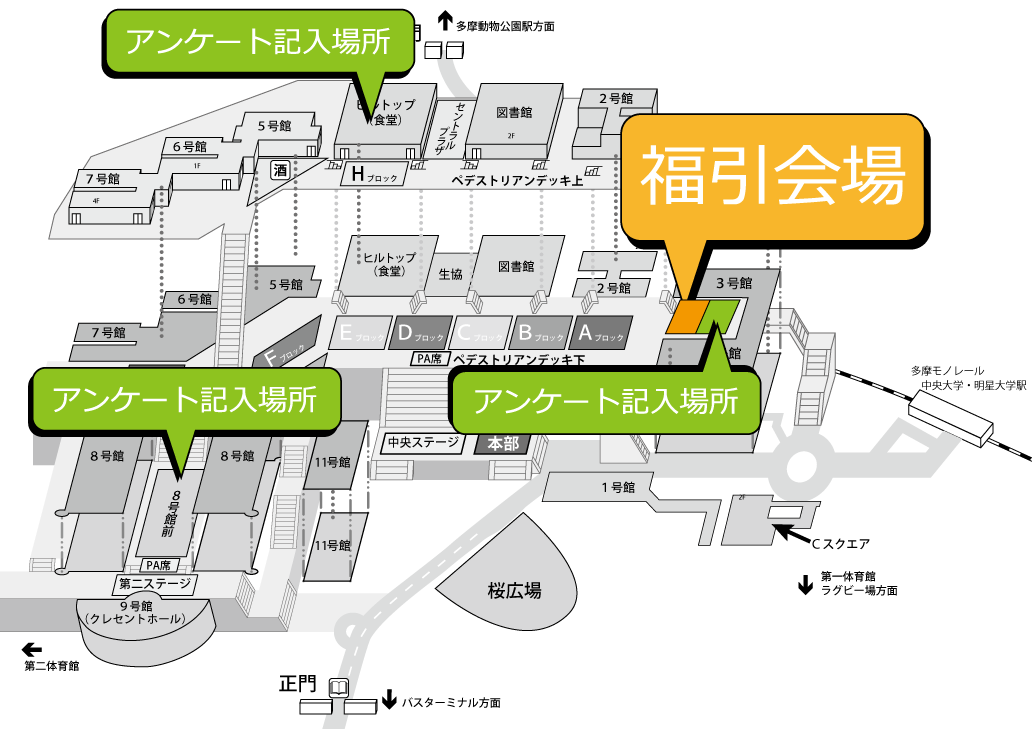 8号館インフォメーション、休憩所(ヒルトップ2階)でアンケート提出された方はそちらで福引券をお渡ししますので、3号館インフォメーション横へお持ち下さい。