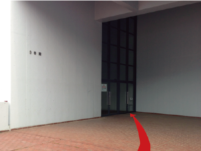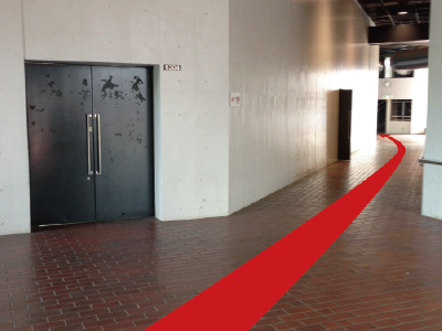 エレベーターをおりたらまっすぐ進み、突き当たりで左にまがってください。目の前に階段が見えるので、その手前でまた左にまがってください。