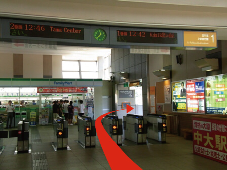 エスカレーターかエレベーターで上にあがると改札があります。改札を出たら右にまがって下さい。